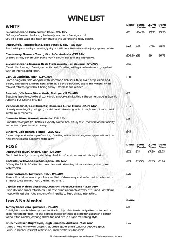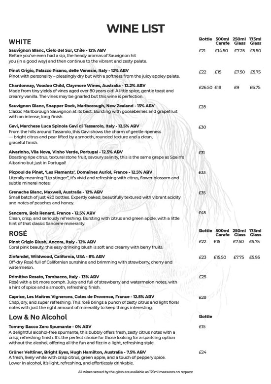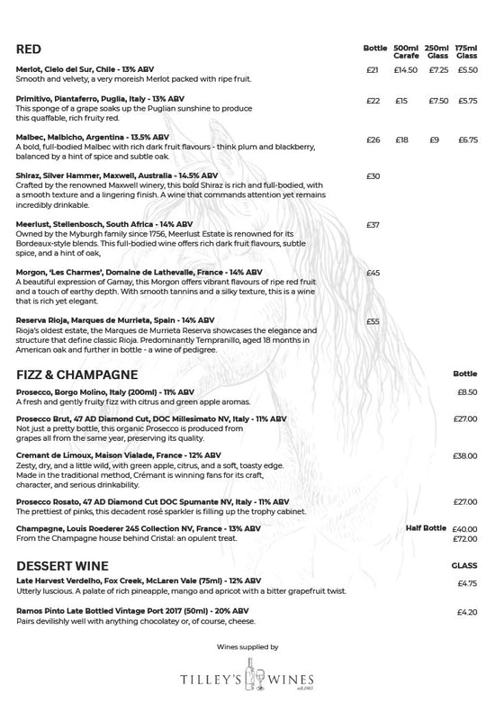Discover our wine offering curated by Tilley’s Wines, an independent Wollaston-based family business who specialise in characterful wines from South Australia as well as small independent winemakers from Italy, France and Spain.